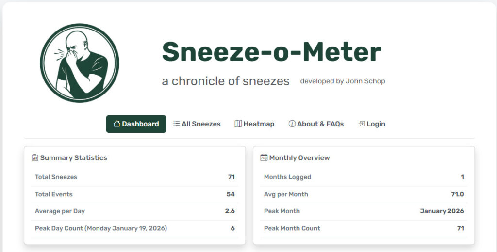 Ik heb dus een web applicatie gemaakt om bij te houden waar, wanneer en hoe vaak in nies. Je kunt het allemaal bekijken op htttps://sneeze.johnschop.nl